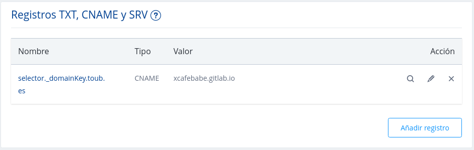 3.- In CNAME records section you should add a new entry pointing to your Gitlab public url